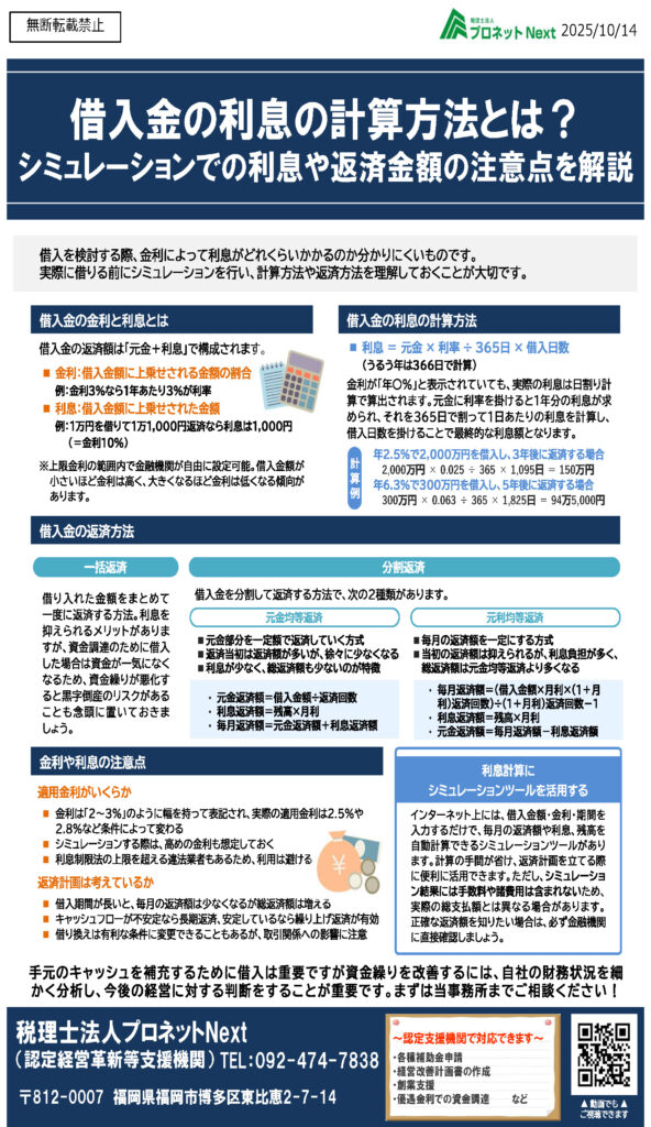 2025年10月14日 / 最終更新日 : 2025年10月6日 pnn_admin 最新トピックス 借入金の利息の計算方法とは? 借入を検討する際、金利によって利息がどれくらいかかるのか分かりにくいものです。 実際に借りる前にシミュレーションを行い、計算方法や返済方法を理解しておくことが大切です。 下記画像をクリックすると、詳細をご確認いただけます。