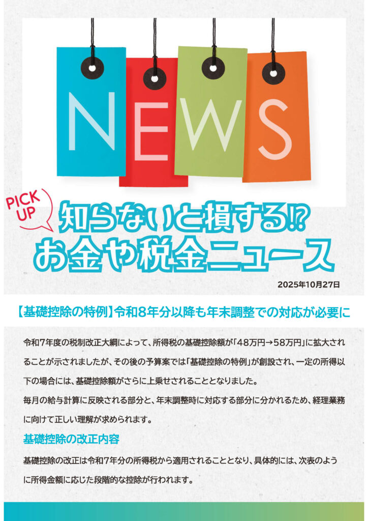 2025年10月27日 / 最終更新日 : 2025年10月6日 pnn_admin 最新トピックス 基礎控除の特例 所得税の基礎控除額が「48万円→58万円」に拡大されることが示されました 一定の所得以下の場合には、基礎控除額がさらに上乗せされることとなりました。 下記画像をクリックすると、詳細をご確認いただけます。