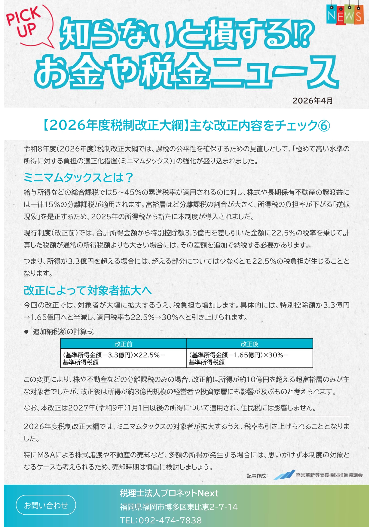 2026年4月6日 / 最終更新日 : 2026年3月23日 pnn_admin 最新トピックス 【2026年度税制改正大綱】主な改正内容をチェック 令和8年度(2026年度)税制改正大綱では、課税の公平性を確保するための見直しとして、 「極めて高い水準の所得に対する負担の適正化措置(ミニマムタックス)」の強化が盛り込まれました。 下記画像をクリックすると、詳細をご確認いただけます。